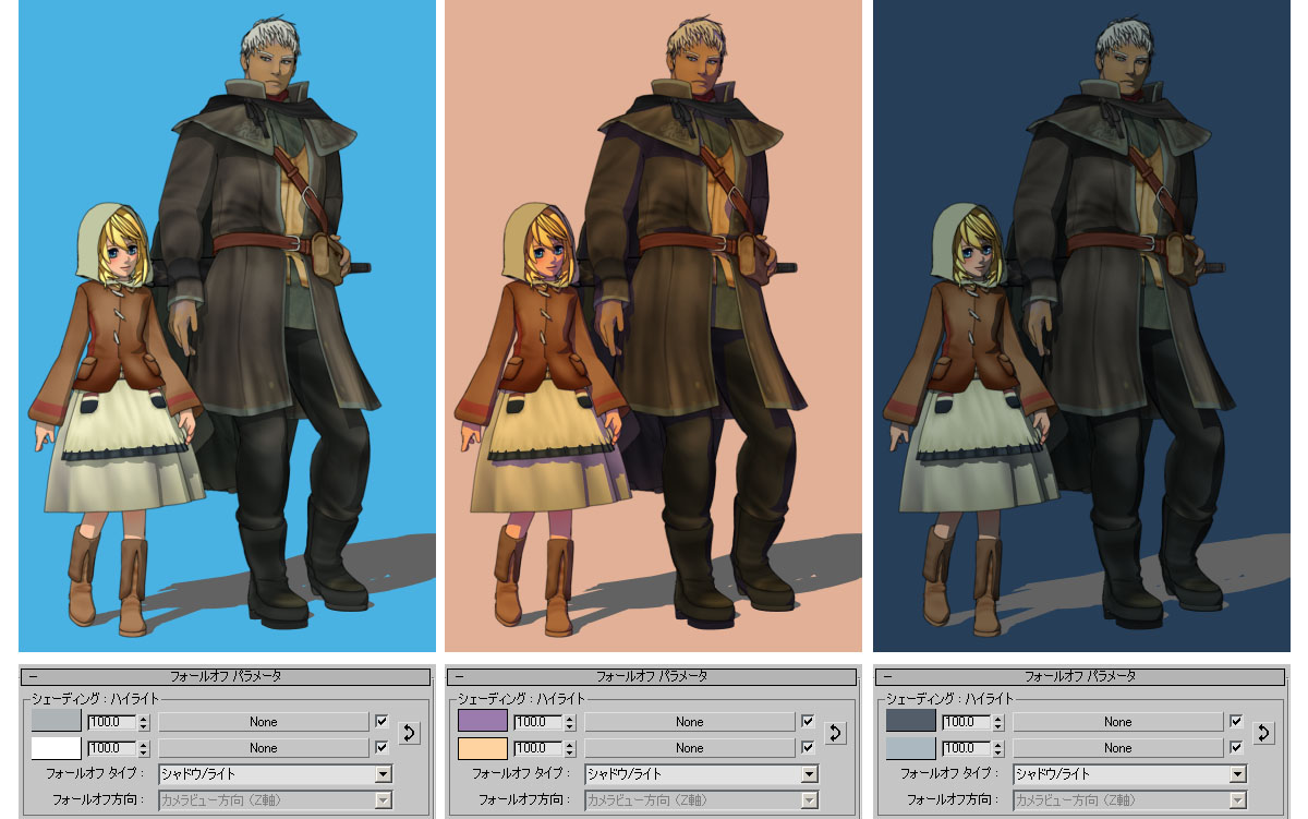 フォールオフのシェーディング:ハイライトカラーを変えてやると簡単に